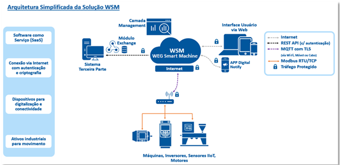O WEG Smart Machine é uma solução amigável e intuitiva, permitindo que os usuários tenham facilidade em seu uso. Com ele, os dados são coletados e armazenados na nuvem, possibilitando o monitoramento e o gerenciamento das máquinas em operação.