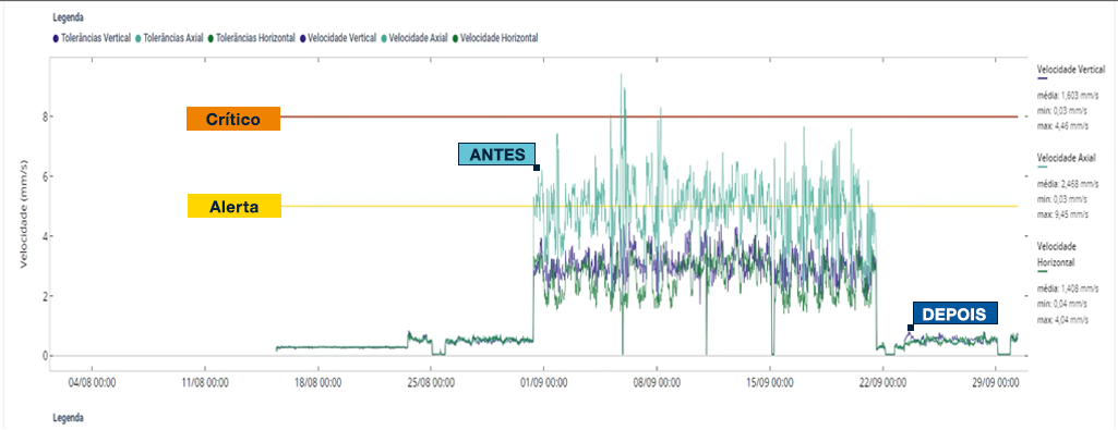 Os dados históricos da plataforma mostram claramente a redução nos níveis de vibração após a intervenção, validando o acerto da manutenção orientada por dados: