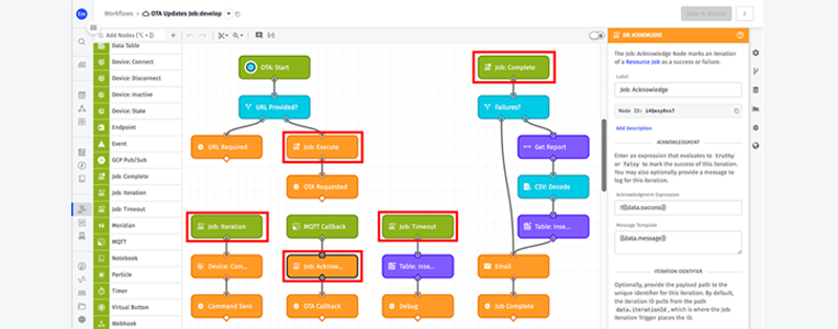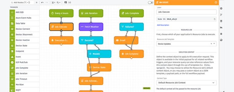 Conforme comentado antes, “Resource Jobs” pode realizar as iterações baseado em uma data table, então, podemos utilizar um node “Update Device” em cada iteração para aplicar os novos valores.