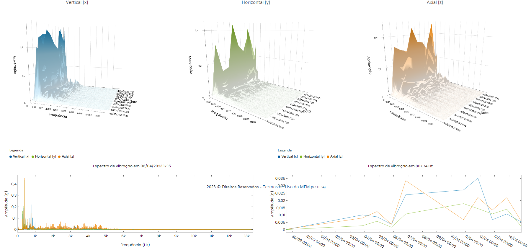 Ao analisar o gráfico cascata 3D, ferramenta disponível no MFM para sobrepor vários espectros, a equipe de manutenção identificou um crescimento das amplitudes próximas às frequências de engrenamento e das frequências de rotação do eixo pinhão.