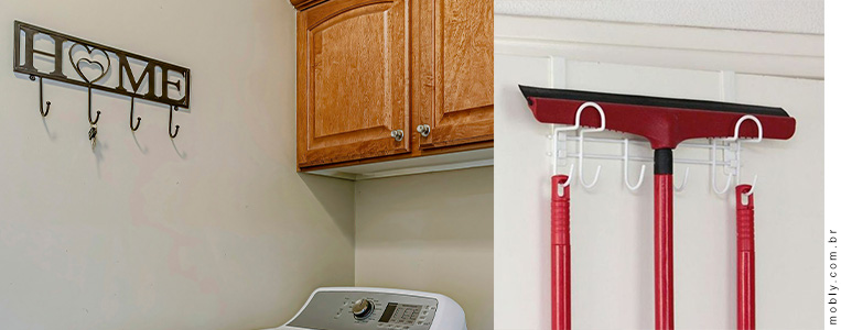Os ganchos parafusados nas paredes são uma maneira barata de organizar os objetos da área de serviço. Você pode pendurar rodo, vassoura, enfim, qualquer equipamento que você precisar. Como resultado, você desocupa o chão da sua lavanderia.