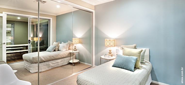 É recomendado o uso de espelhos em porta de armários ou em conjunto sobre a cabeceira da cama, tornando assim o ambiente mais elegante e bonito. Lembre-se de que espelhos em frente à cama podem gerar incômodos na hora de dormir.