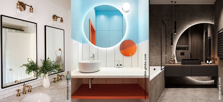 O uso de espelhos no banheiro é um clássico. Mas você pode sair do clichê apostando em espelhos maiores que cubram toda a parede do balcão até o teto ou então em espelhos com luzes embutidas que ajudam muito na hora de se arrumar.
