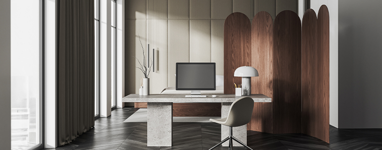 Crie um canto de trabalho aconchegante em um ambiente maior usando uma divisória de madeira. Além de delimitar o espaço, a divisória pode ajudar a reduzir o ruído e proporcionar um ambiente mais focado.
