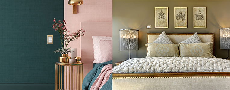 Nos quartos o uso das tomadas e dos interruptores Refinatto na cor Ouro Velho deixam esse ambiente mais sofisticado.