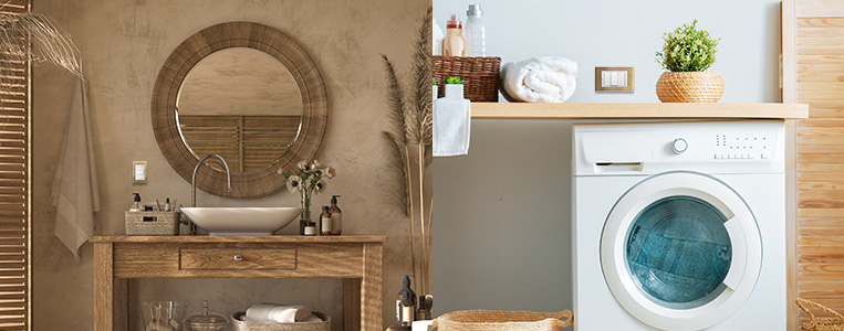 Outros ambientes que combinam muito com a cor Ouro Velho, são os banheiros e os lavabos. As tomadas nessa tonalidade podem combinar com o espelho, ganchos e torneiras desses ambientes. Até mesmo em lavanderias é possível fazer uma boa composição com essa cor.