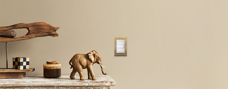 O efeito da cor Ouro Velho das tomadas e dos interruptores da linha Refinatto é o de luxo e elegância. É um efeito mais sóbrio, mas que chama a atenção.
