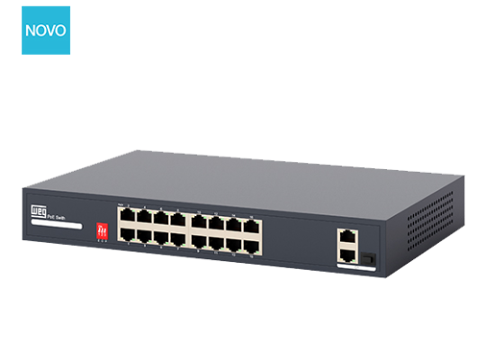 Swtich com 16 portas PoE+ 10/100 Mbps + 2 portas Uplink 10/100/1000 Mbps + 1 porta SFP 1000 Mbps, função extender(E) permite aumentar o alcance de dados para até 250 m e segmentação de rede, função vigilância (D), permite o switch reinicar a fonte de energia do dispositivo quando ocorre uma falha na comunicação de rede. Função prioridade (P) permite o switch priorizar a potência de saída PoE, capacidade de comutação 7.2 Gbps.