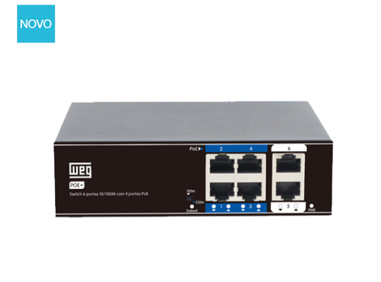 O SWITCH WEG M04-P31 conta com 4 portas PoE+ e 2 portas Uplink, garantindo uma conexão estável para atender o seu projeto de segurança eletrônica.